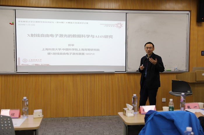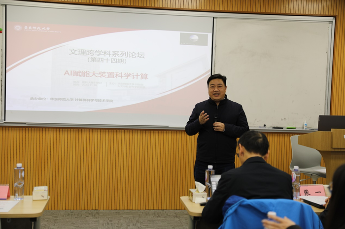 2024年11月18日下午,泥巴影视 学科交叉融合论坛(第四十四期)在理科大楼B座1002室和线上腾讯会议同步举行,论坛主题为“AI赋能大装置科学计算”。围绕人工智能如何赋能大科学装置的数据计算和处理,论坛邀请了上海科技大学的怀平研究员、中国科学院高能物理研究所的张一副研究员、中国科学院上海高等研究院的王春鹏副研究员、华东理工大学物理学院副院长张孟副教授,以及泥巴影视 计算机与科学技术学院的林绍辉研究员作特邀学术报告,并共同参与圆桌讨论。本次论坛由泥巴影视 科技处、人文与社会科学研究院主办,泥巴影视 承办。计算机与科学技术学院何高奇教授负责组织这次论坛并主持了五场特邀报告。来自泥巴影视 、上海科技大学、上海交通大学、中国科学院上海应用物理研究所、上海科技馆等机构的五十余人参与了此次论坛,其中线下参会三十余人。