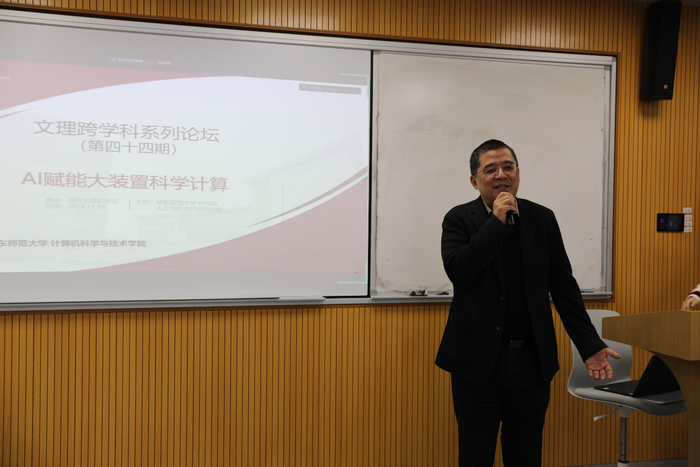 最后数据科学与工程学院党委书记王长波教授代表视觉与媒体智能团队致辞。他首先对各位专家莅临华师大指导工作表示欢迎,并指出人工智能带来的深层次变革席卷所有的行业;本次论坛紧扣科学计算这一国家战略需求,具有重要的意义和价值。他期待与会者通过交叉研讨,共同为大科学装置的未来发展贡献智慧。