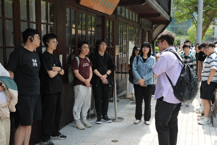 活动的第一站是1920毛泽东旧居纪念馆,这是一幢沿街的坐南朝北砖木结构的两层楼房。楼下是客堂间,陈设着一张方桌和几把椅子,用于会客和就餐;楼上和亭子间则是卧室。在历史系同学的讲解下,我们了解到,1920年5月5日抵沪至7月初离沪期间,毛泽东一直居住在这里,期间开展了驱逐湖南军阀张敬尧的斗争,探讨湖南的改造问题,参加了“半淞园会议”,讨论新民学会的会务问题,欢送湖南青年赴法勤工俭学,拜访陈独秀并探讨马列主义,阅读了大量共产主义论著。正是在这段时间,毛泽东最终选定了人生之路,确立了马克思主义者的初心,这段时期的思想转变在这处寓所中见证了毛泽东的成长与蜕变。如今,这幢砖木结构的楼房已被现代化的高楼包围,步履匆匆的人们穿梭于这一片繁华商圈,偶有人推门进入这幢安义路上的两层楼房,追寻青年毛泽东的思想轨迹。