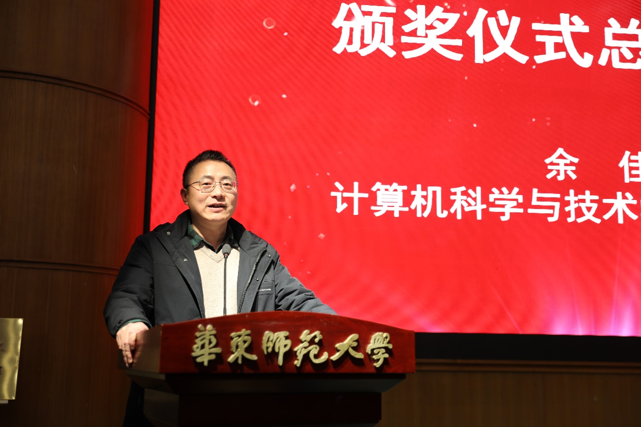 颁奖典礼最后,计算机学院党委书记余佳作总结讲话。他代表学院对获奖师生再次表示热烈祝贺,并对捐赠企业再次表达诚挚感谢。他还向获奖师生提出期许,鼓励大家秉持创新精神,提升专业能力,致力于科技进步和社会服务,为国家建设世界一流科技强国,实现中华民族伟大复兴贡献自己的力量。