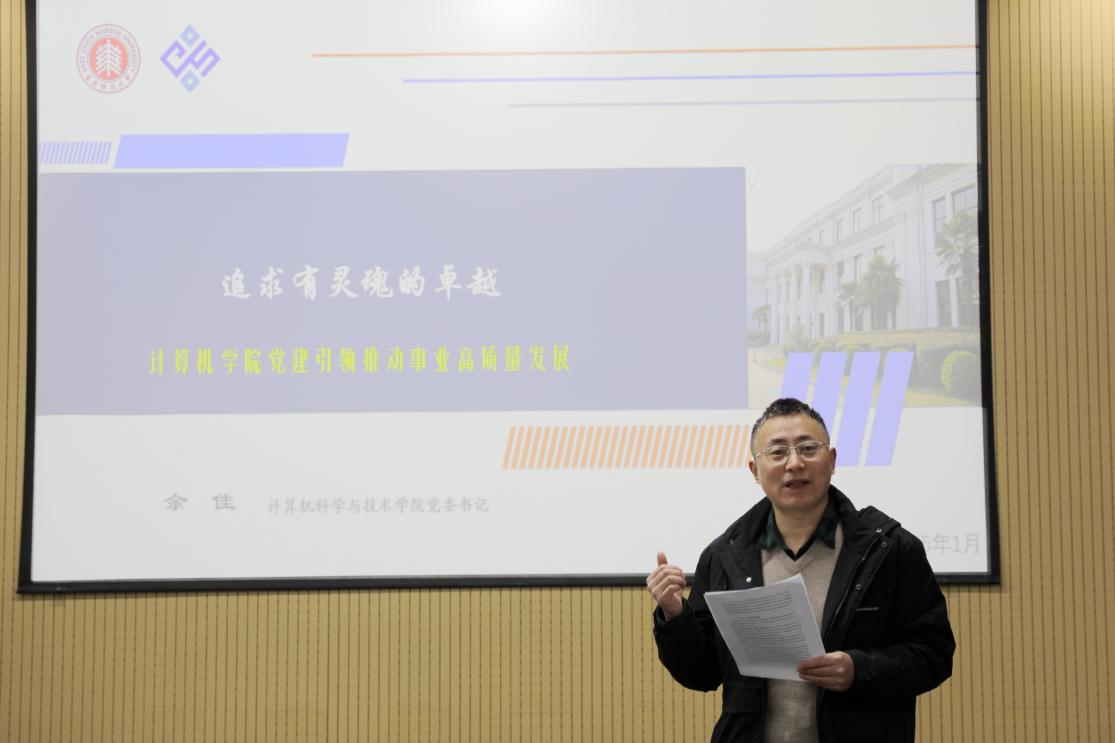 学院党委书记余佳首先做抓党建工作述职报告。他从年度履职情况、查摆短板不足和分析原因、下一步工作思路和举措三个方面做了工作述职。2024年来,计算机学院党建工作紧紧围绕高质量发展要求,努力做到党组织领导和运行机制到位、政治把关作用到位、思想政治工作到位、基层组织制度执行到位、推动改革发展到位,引领学院整体工作站上新的台阶。但与此同时,学院的治理能力和治理水平与高质量发展要求还存在差距,学院发展面临的条件约束和资源瓶颈还缺乏破解的有效方法,学院组织架构与组织体系还有待完善。下一步,学院党委还要进一步提升主动谋划、对接国家重大战略的意识和能力,团结带领全院教职员工,坚持高质量内涵发展不动摇,争取学院整体工作再上新水平。