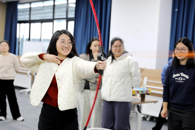 “趣味射箭”区则成为另一大热门打卡点。大家手持弓箭,瞄准靶心,体验“弯弓如满月”的乐趣。无论是首次尝试的新手,还是稳中求准的“神射手”,都在专注与欢笑中收获了满满的成就感。活动现场还穿插了幸运抽奖环节,多位老师喜获奖品,将节日氛围推向高潮。
