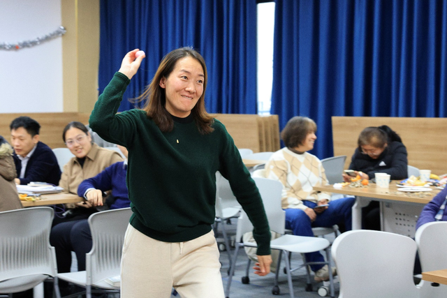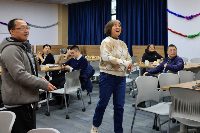 接着,联欢活动正式开始。不少老师参与学院工会组织的掷球游戏,一些老师还主动登台,为大家演唱助兴。