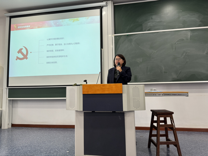 随后,韩璐就学院的学生党建工作做了详细介绍,包括特色支部活动和党建品牌建设等内容。她对研究生党员提出了具体要求:不仅要努力提升自身的理论修养,在日常学习工作中树立良好榜样,还要积极参与支部活动和志愿服务中去;面对挑战时更要勇于担当,率先垂范。