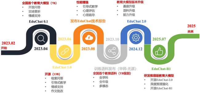2023年4月,首个专注于教育领域的垂直大模型正式问世,开启了教育人工智能的新篇章。同年6月,团队发布了开源版本EduChat 1.0,为智能教育的发展注入强大动力。8月,进一步公开了详尽的训练报告与参数信息,为教育行业研究提供了坚实基础。10月,重磅推出“华师-学海无涯”教育语料数据集,涵盖超过13TB的高质量数据,极大丰富了教育大模型的数据生态。进入2024年,研发重点转向功能优化与场景拓展,成功升级引导式教学功能,并创新性地将AI应用于心理健康领域,推出新一代教育大模型EduChat 2.0,推动智能教育向更深层次、更广维度延伸。在过去三年中,团队深入调研一线教学场景,持续打磨技术,累计内测十余个版本,并在多款下游教育产品中不断迭代优化。最终,在2025年7月,正式发布EduChat-R1,构建了“Thinking before teaching”的智能教育新范式,并研发多款智能化教育产品,实现了教育大模型在性能与应用生态的全面跃升。