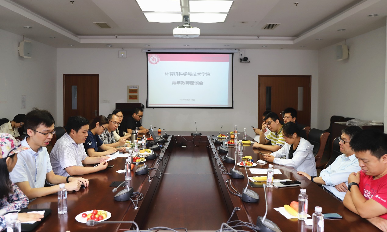王长波书记首先阐述了召开本次座谈会的初衷。经历过今年上半年的特殊阶段,值此新学期之初,教学科研各项工作全面铺开,青年教师作为学院发展的中坚力量,希望通过座谈会的形式增强青年教师间的交流,为学院的学科评估、十四五规划等工作出谋划策、助力发展。周爱民副院长简要介绍了学院目前开展的各项重要工作,包括配合学校“智能+”、“教育+”行动计划,参与学校智能教育研究院建设及相关博士培养计划,开发在线学习系统等,鼓励青年教师投身其中,将自身的发展与学科、学院的发展相结合,积极寻求合作机会,贡献自身的力量。
