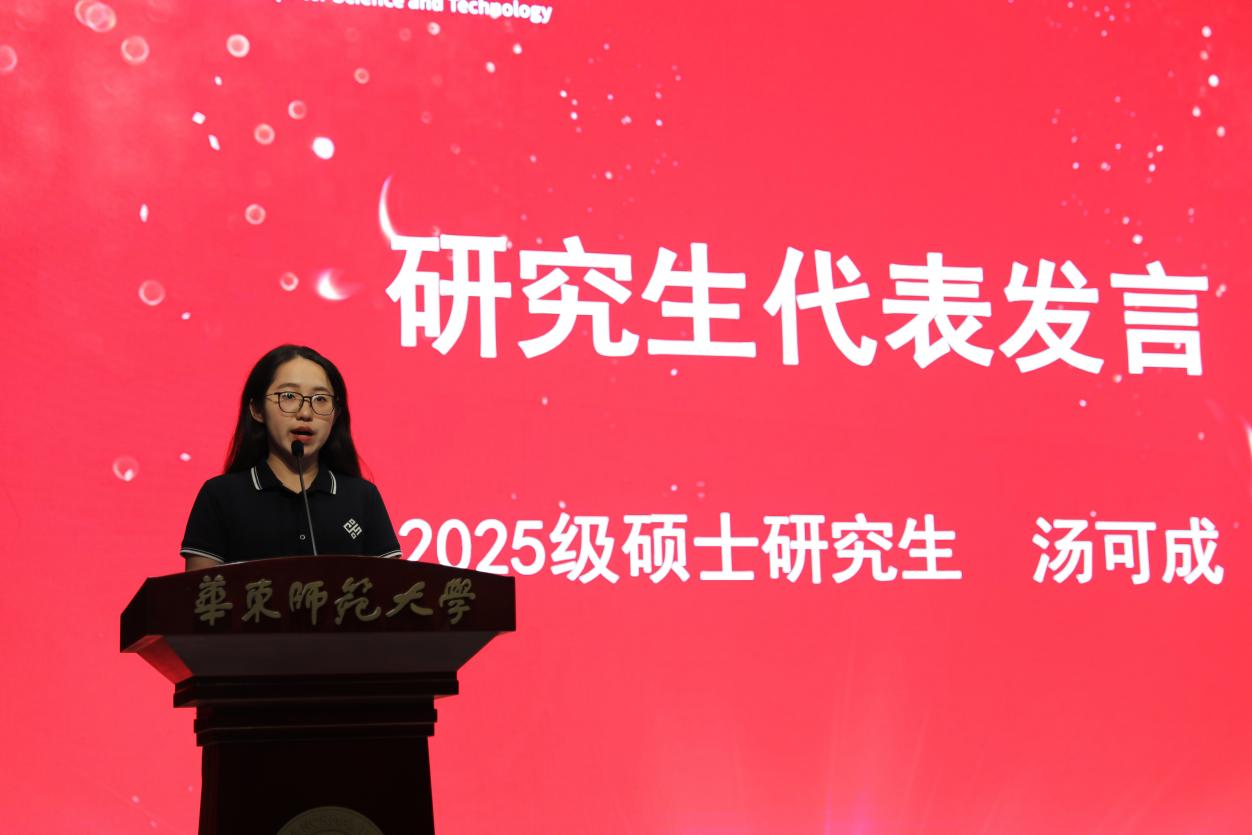 紧接着,研究生代表汤可成同学发言。她以“无限游戏”的视角比喻科研之路,强调研究生阶段不仅是学业的起点,更是人生的“升级”。她指出,科研充满未知与挑战,但更重要的是保持长期成长的心态,勇于跨越学科边界,不断提出问题并追寻答案。她将自己比作“正在训练的大模型”,鼓励同学们在不断学习与迭代中找到属于自己的“奖励函数”,保持对知识的渴望、对真理的追求和对社会的责任感。她还结合人工智能、大数据等前沿领域的发展,号召同学们以开放的心态迎接挑战,用青春与智慧书写属于这一代计算机学子的崭新篇章。