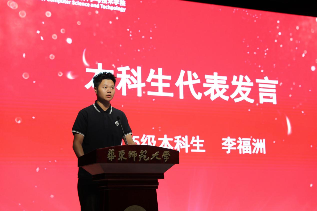 2025级本科生代表李福洲同学在发言中,表达了初入校园的欣喜与感动。他回顾了从报名到军训期间,感受到的学院师生的人文关怀与温暖氛围,并表示更加坚定了学习计算机的信心和热情。谈及对未来的期待,他认为在数字时代,计算机技术已深刻改变社会生活,每一行代码和算法都可能推动社会进步。他提出了三点具体计划:一是打好“基本功”,扎实掌握编程和数据结构等核心课程;二是积极参与科研与学科竞赛,提升解决实际问题的能力;三是注重团队协作,学会倾听与分享。希望大家在计算机的广阔天地里找到属于自己的光芒,共同书写青春的华章。