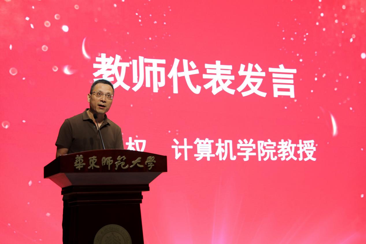 在热烈的掌声中,张桂戌院长为新生致辞。他回顾了学院在学科建设与人才培养方面取得的丰硕成果,强调学院在机器学习、计算机视觉和计算机系统等领域的持续创新与贡献,并对新生提出殷切期望:深入认识自己,要树立科技报国之志;提升思维能力;永葆科技报国之志,勇于探索创新,肩负起时代赋予的使命。致辞的最后,张桂戌院长寄语大家:愿你们在丽娃河畔的晨光中汲取智慧,在实验室的灯火里锤炼本领。当你们未来回望这段时光,愿你们能骄傲地说:我们不仅编写了改变世界的代码,更用科技守护了这片先辈用热血浇灌的土地。