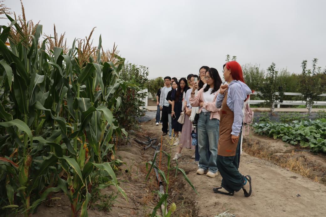 随后,同学们来到了青浦区蒙田科技农场。大家跟随讲解员走入科技大棚,了解各类常见蔬菜的生长习性以及营养价值,每种不同的蔬菜都有着独特的播种、照料方式;在大棚外,同学们参观了农场的创新课程教室、科学实验室,走进农场的“直播间”,看到了由小朋友们新手摘下的农作物们,欣赏了小朋友们制作的农作物画和手工艺品。大家不仅学到了现代农业的生态模式,也对于“助农惠农”“科教结合”有了更加深入的感受。