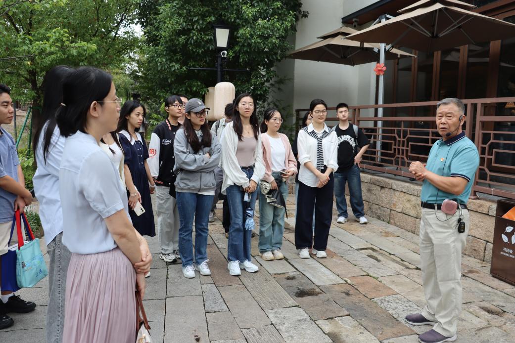首先,同学们来到了徐泾镇蟠龙新天地。来自徐泾社区党校、徐泾镇“泾彩宣讲”团成员孙永明老师为同学们带来了一场跨越历史、生动有趣的行走党课。孙老师将蟠龙的“香花桥、十字街”等一个个历史文脉场景娓娓道来。在孙老师口中的蟠龙镇,拥有着蟠龙十景、九龙一凤古桥,蕴含着丰富而独特的历史文化特色。然而,作为上海首批城中村改造项目之一,蟠龙“城中村”因经济发展不平衡,导致村内发展滞后、环境混乱,古建筑、古街道衰败,河道淤塞、垃圾随处可见;如今,在经过治理改造后,蟠龙镇摇身一变成为现代商铺鳞次栉比的古镇,白墙黛瓦、草木生辉,全国各地的游客纷至沓来。“香花桥旁香花亭,香花满溢香花情。”通过孙老师的讲解,大家沉浸式调研了蟠龙新天地的历史底蕴与文化脉络,体悟传统文化与商业融合发展新路径,对于文化传承与民生改善都有了自己独特的感悟与见解。