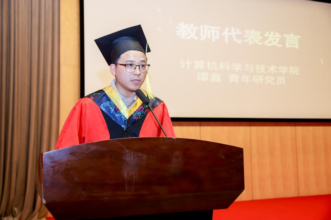 教师代表、青年研究员谭鑫寄语2025届毕业生,他表示人工智能是年轻且充满活力的事业,同学们要选择热爱的事业,保持持久热情,在技术革命的最前沿追求卓越;要合理安排生活,保持身心健康,为长期创造力奠定基础;要勇于面对挑战,在人工智能的赛道上勇攀高峰,用扎实的成果为战略领域贡献力量;同时不忘初心,常回母校,为学院发展凝心聚力。