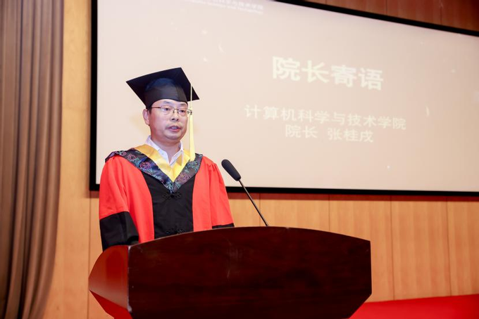 毕业典礼在雄壮的国歌声中拉开帷幕。院长张桂戌为毕业生送上毕业寄语。他向2025届毕业生们致以最热烈的祝贺,并向悉心培育学生的老师、家长和校友们表达了诚挚感谢。他期望大家胸怀“国之大者”,勇担时代使命;坚持终身学习,练就过硬本领;永葆赤子之心,常怀感恩之情,在科技强国和民族复兴的征程中贡献青春力量。